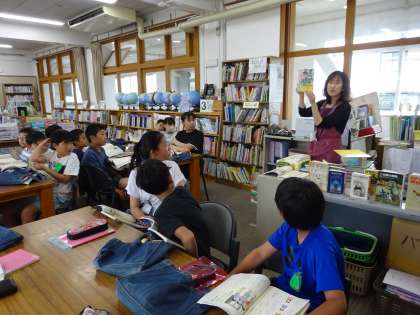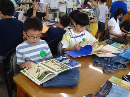 同じ作家の本を紹介するために、図書館で本を借りました。これまで学習してきた教科書に出てきた作家などを見つけると、「あっ、これ知ってる」「この本と一緒の人がかいているんだ」と気付いていました。