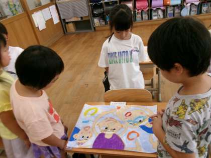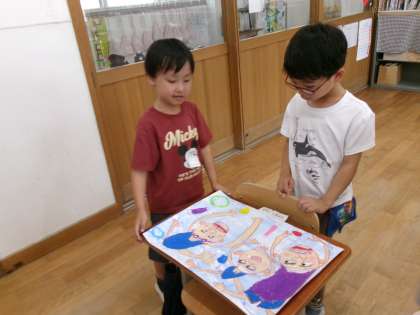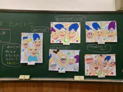 図画工作「プールにもぐって たのしいな」の絵が完成しました。完成した絵をみんなで見合いっこをしました。友達の絵を見ながら、「手の感じが上手だね。」「色の塗り方が丁寧だし、まねしたいよ。」など、たくさん友達のよい所を見つけていました。