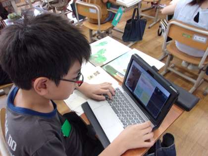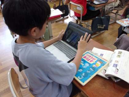国語科では、同じ作家の本を選び、紹介カードを作成しています。作家によってストーリーが似ていたり登場人物の特徴が近かったりと、同じ作家の本を読むおもしろさを見つけていました。