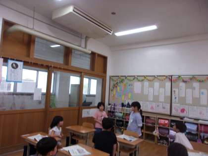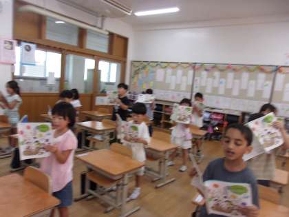 「ドアを開けるときにガラガラ〜って鳴ってたよ」「黒板にもチョークで文字を書くときにトントントンという音が聞こえたよ」と、見つけた音を紹介し合いました。