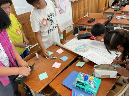 お互いに作った新聞を見ながら、良いところを伝えあっています。