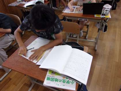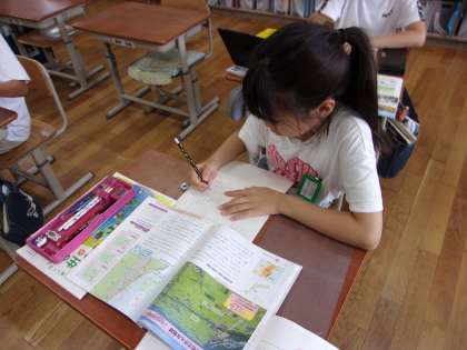 米づくりについて学んだことを、新聞にまとめています。小見出しをつけたりグラフをかいたりと工夫していました。