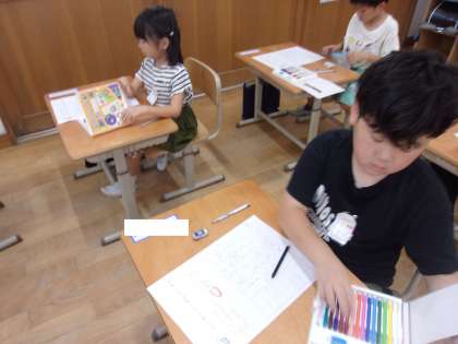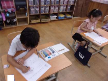 昨日生活でやった水遊びや、虫さがし、タブレットの学習など、楽しかったことを絵と文で書いていました。