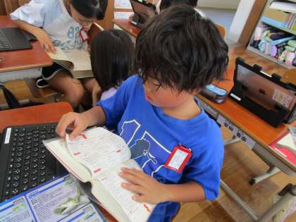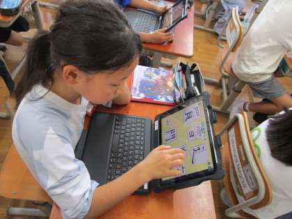 国語科で漢字の「へんとつくり」や「かんむり」「しんにょう」など、漢字の組み立てを学習しました。タブレットでパズルのように組み合わせたり、漢字の意味を国語辞典を使って調べたりしました。