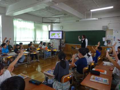 新しいALTの先生と一緒に学習しました。自己紹介のスライドを見ながら、アメリカの文化などについて教えてもらいました。