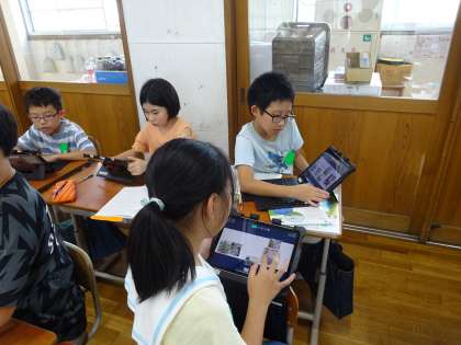 水揚げされた魚は、どのようにスーパーマーケットに届けられているのかを予想しました。写真から何をしているのかを考え、ペアで話しました。