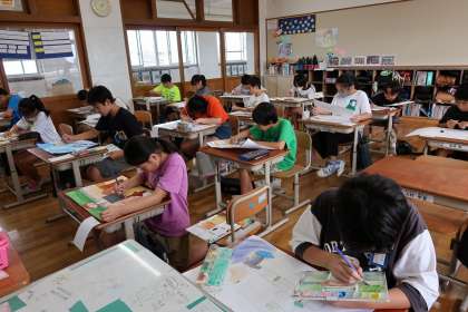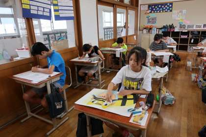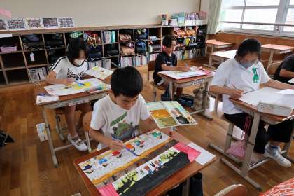 図画工作科「お話の絵をかこう」の学習の様子です。