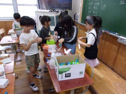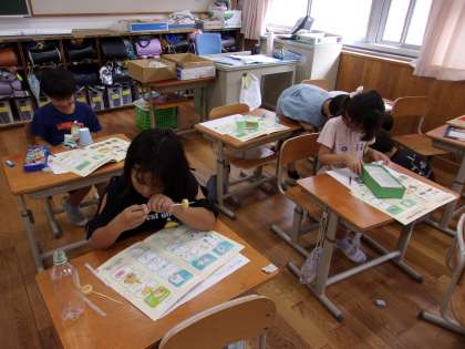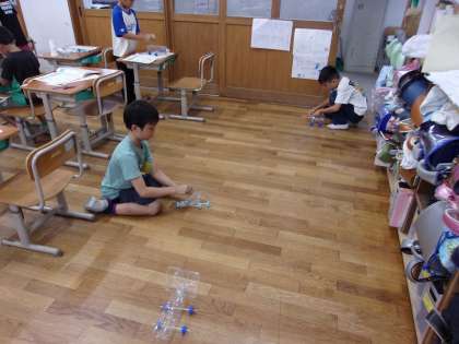 お菓子の箱やペットボトルのふたなどを組み合わせて、思い思いのおもちゃを作っていました。