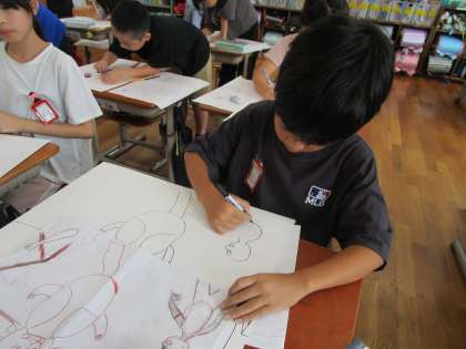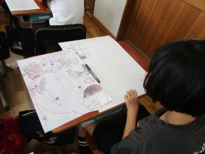 お話の絵が着々と進んでいます。今日は画用紙にペンやコンテを使って下絵をかきました。