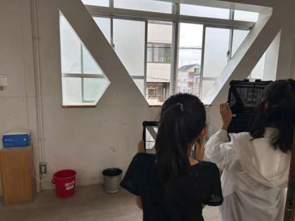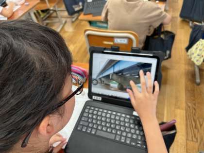 自然災害から守るには、どのような施設や取組がタブレットや本、校舎を回って調べました。