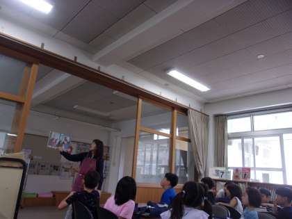 今日の図書の時間では、学校司書の先生に「かぜがつよいひ」という不思議なお話を読んでもらい、楽しそうに聞いていました。
