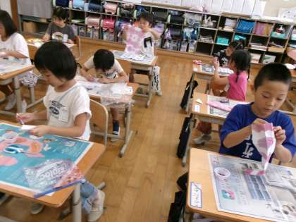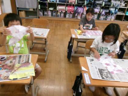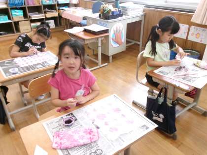 アサガオの色水を使って、半紙に模様をつけました。「どんな模様になっているかな?}と、ワクワクしながら折りたたんだ半紙をそっと広げていました。世界に一つしかない自分だけの模様ができあがり、大喜びでした。