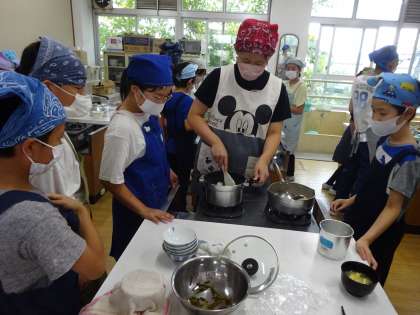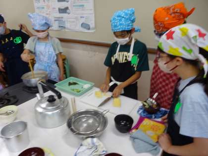 班で協力してご飯とみそ汁を作りました。役割分担で決めた仕事だけでなく、その場で「私、洗い物するね」や「〜おねがい」などと声をかけあいながら進めていました。自分たちで作ったみそ汁とご飯を味わって食べていました。