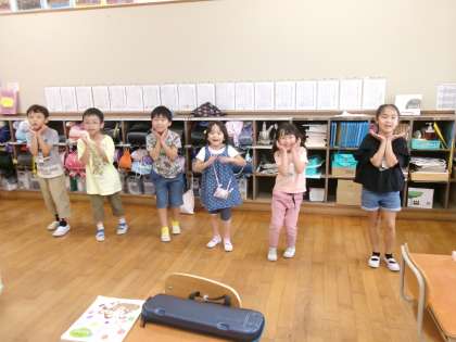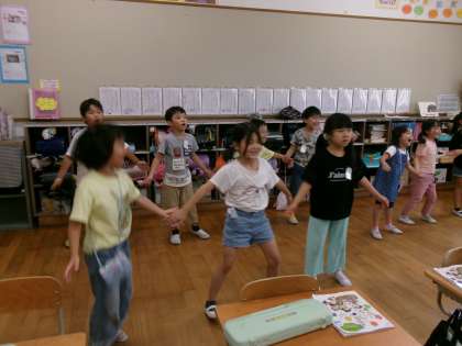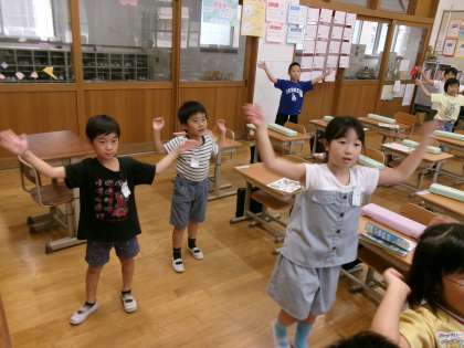 あかしやスポーツ大会で、準備体操として「手のひらを太陽に いいじゃん!」の曲に合わせて準備体操をします。とても楽しいダンスなので、みんなノリノリで踊っています。知っている曲なので、歌いながら踊っています。
