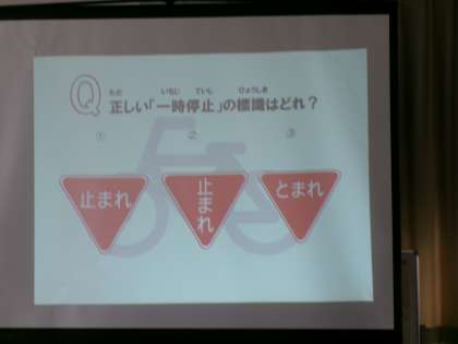 自転車は車と同じ左側通行をすること、スピードを出しすぎないことをクイズをしながら学んでいます。