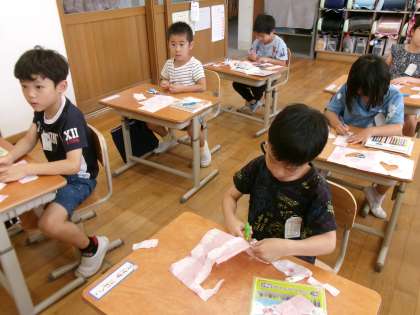 アサガオの色水を浸した紙で、しおりを作りました。どんな形のしおりにしようかと工夫を凝らしていました。それだけではなく、きれいな絵を描いたり、押し花を付けたりととても素敵なしおりができあがりました。出来上がったしおりを早速、読みかけの本に挟んでいました。