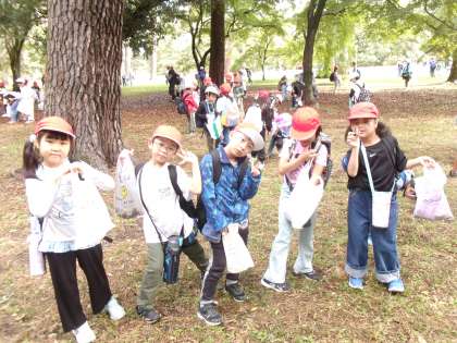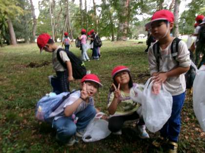御所に到着すると、まず、白雲神社にいきました。そこには、クヌギと松ばっくりがたくさん落ちていました。「やった〜!見つけた!」と宝物を見つけたように、嬉しそうに袋に入れていました。