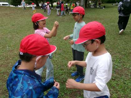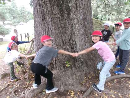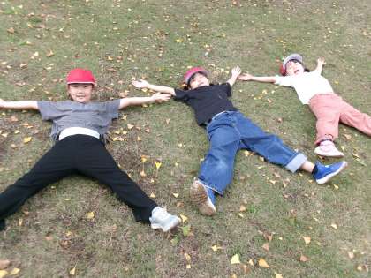 おいしい昼食の後は、イチョウの木の周りで遊びました。転がってみたり、木の周りを囲ってみたり、近くでおにごっこをしたりたくさん楽しみました。