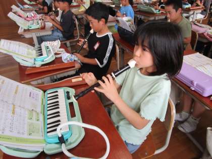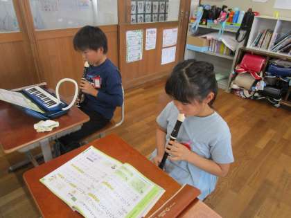 「ゆかいな木きん」のリコーダーパートを練習しました。けんばんハーモニカと一緒に合奏すると、きれいなハーモニーになりました。