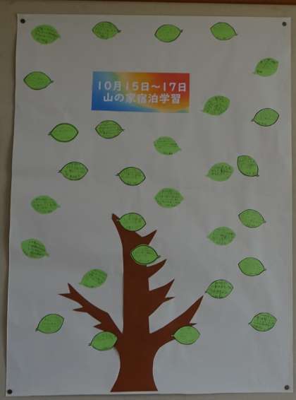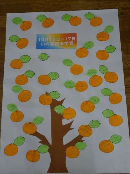 山の家宿泊学習の振り返りを行いました。事前学習の際に自分のめあてを葉っぱに書いておきました。学習を終えて、今日はみかんの用紙に振り返りを書きました。自分のめあてをしっかりと達成できたようです。