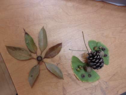 今日は、松ぼっくりや枯れ葉、どんぐりを並べて作品を作りました。
