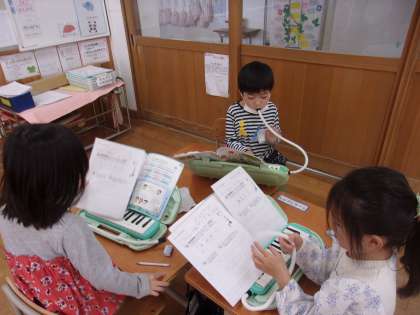 友達とよびかけ合ったり、くりかえしたりして楽しそうにせんりつづくりの活動をしていました。