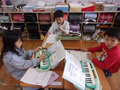 「ドレミファソ」の音の中から好きな3音を選び、せんりつづくりをしました。そしてそれを友達とつなぎ合わせて音楽づくりをしました。