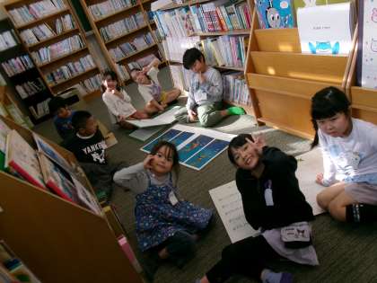 図書館で読書をするのが、大すきな1年生。本を借りた後、友達と大型絵本を広げて、楽しそうに読んでいました。