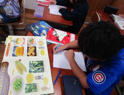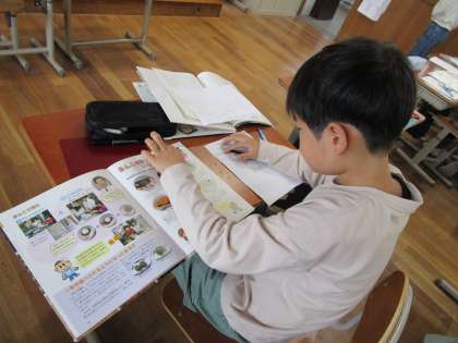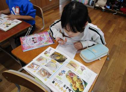 食べ物のひみつを本で調べています。食べ方の工夫などメモがたくさん増えてきました。