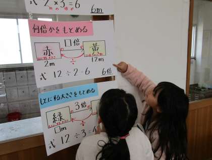 関係図を使って、倍の数やもとになる大きさなどをもとめる学習をしています。