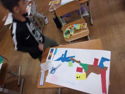 図画工作の時間に、いろいろな形に破いた画用紙を貼って、作品を作りました。