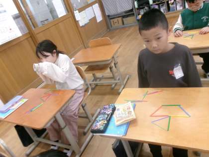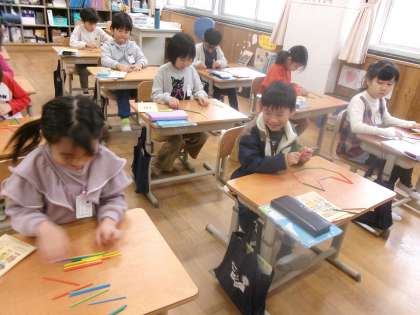 今日のかたちづくりは、色棒をならべてかたちを作りました。隙間ができないように、1本1本丁寧に並べていました。そのあと、自分でも好きな形にするため、棒を並べて遊びました。
