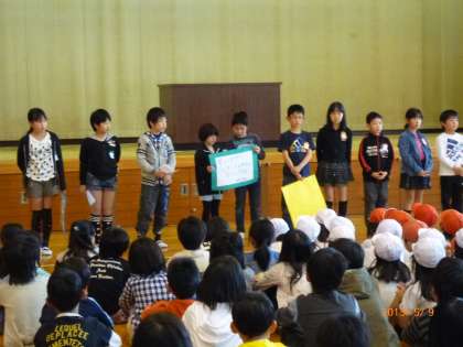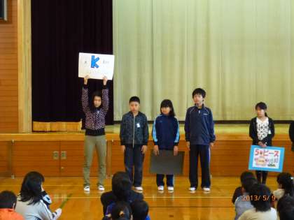 各クラスの学級目標を各学級の代表委員が朝会で発表しました。担任からこんな学級目標にしましたと伝えるのではなく,自分たち自ら全校に学級目標を発表し,学級目標達成に向けて,実践することが大切です。学級目標達成に向けて,具体的にどのようなことをすればよいか,自主的に考え,実行します。