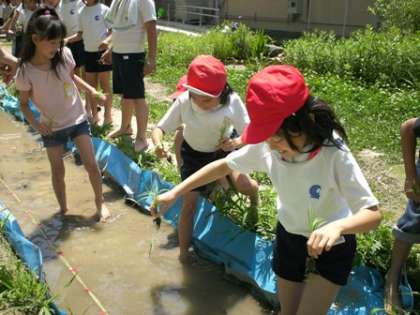 雲1つない青空の下,「いのちの庭」の田んぼで田植えをしました。