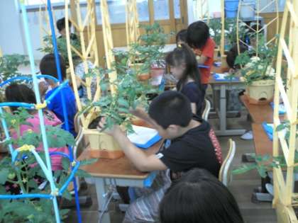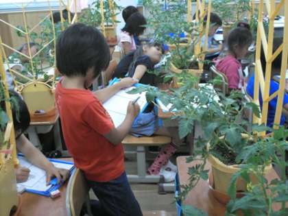 「緑色の実が3つあるよ。」「2つ大きくなってるよ。」口々にお話してくれます。みんな,とってもうれしそうです。