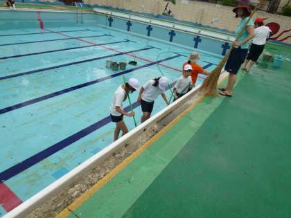 泥や落ち葉で汚れたプールを一生懸命こすってきれいにしていました。