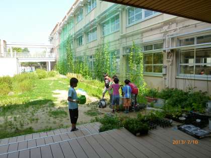 毎朝,PTA(朱雀大路コミュニティー)と子どもたちが一緒になって,グリーンカーテンの水やりをしていただいています。