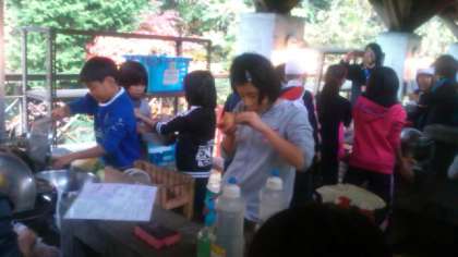お昼は鶏すき焼き風煮を作りました。火をつけるのにとても苦労しました。ぶくぶくとご飯がふいてきて,しばらくするとできあがり。味見をしてみると,できたてご飯はほくほくしてとてもおいしいです。すき焼き風煮もできて,いただきます。自分たちで作ったご飯は格別おいしいです。