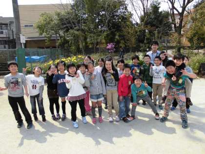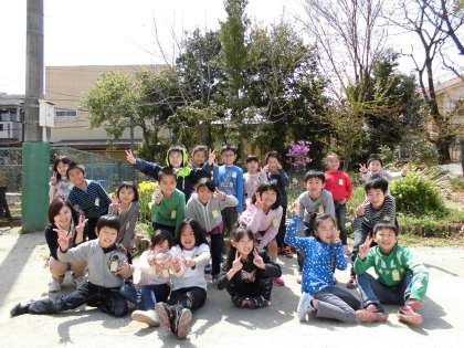 暖かい春の日差しの中,あかしやの森の花壇の前でクラス写真を撮りました。