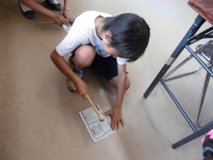 その後は,叩き染め体験をさせてもらいました。葉を叩いて,和紙に色をうつして,うちわを完成させました。