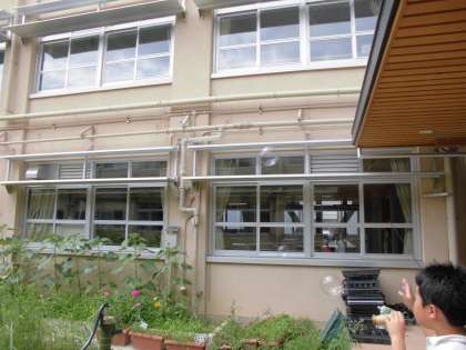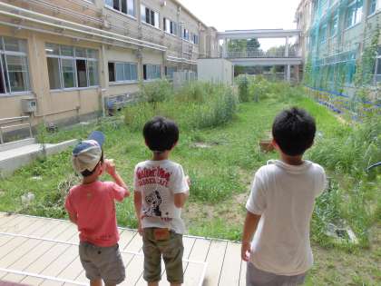 1年生と2年生でシャボン玉の液をつくり,強く吹いたり,優しく吹いたりして,どうすれば大きなシャボン玉が作れるか工夫してしました。丁寧にふくらましたシャボン玉がいのちの庭をふわふわと飛んでいました。