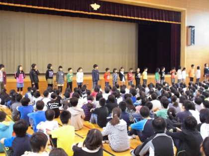 今日の児童朝会で,「本部役員」「後期代表委員」の紹介がありました。
