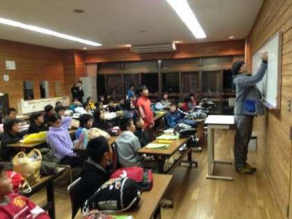 天体観測は、曇り空でしたが少しだけ観察することができました。入浴後は、研修室で最後の振り返りをしました。山の家の活動を終えての自分の成長を交流しました。