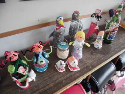 図画工作科「ガラスびんのへんしん」の学習で,ガラスびんに紙粘土やモール,ビーズなどをつけて,楽しい人や動物をつくりました。