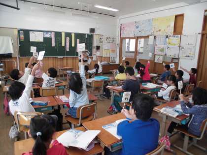 くじらぐもに飛び乗る場面では,作った子どもたちのペープサートを高く上げ,くじらぐもの上に載せている子もいました。