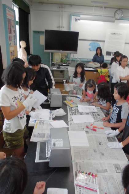 朱雀第四小学校からは,5,6年生が「オストシズム(ふちんし)」「プラバン」の二つのブースを出しました。ブース担当の子どもたちはブースに来る友だちにわかりやすく説明できるように学校で練習した成果を発揮していました。