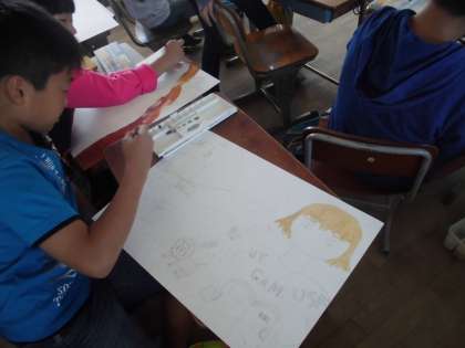 お話を聞いて,絵を描き始めました。