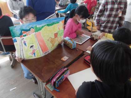 丁寧に仕上げたお話の絵を,みんなで見合いました。