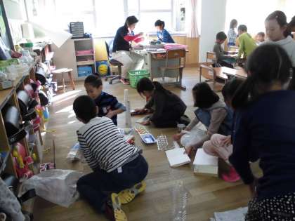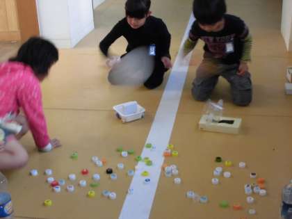 今日の学習は,一人ひとりが作ったおもちゃを使って,みんなで楽しく遊べる方法やルールを考えました。ころがる・とぶ・はしるなどいろいろな工夫のあるものを使って,遊びを考えています。2年生で遊ぶ日が楽しみです。