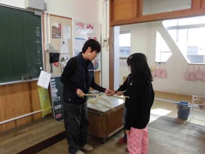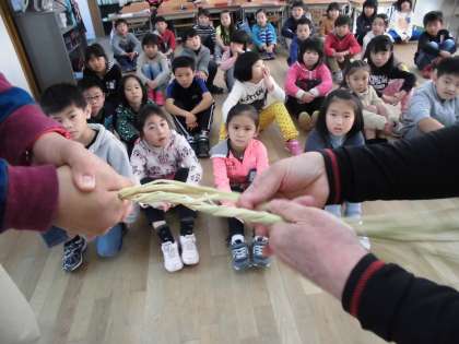 稲刈りをした時に残しておいたわらでしめ縄を作りました。管理用務員さんに教わりながら縄を編んでいきました。力の入れ具合などなかなか難しかったけれど一人ひとりがすてきなしめ縄ができました。